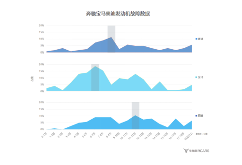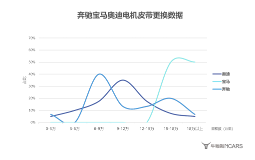 通过对比电机皮带更换数据,可以看出,奔驰的电机皮带更换高峰期发生在6-9万公里时,奥迪的高峰期在9-12万公里,宝马的更换高峰期则是在15万公里之后。 5、三个品牌中,最早出现发动机故障的是奔驰,最晚的是奥迪,数据侧面反映了大众普遍对奥迪发动机烧机油的故障认知,随着发动机的改进,已经成为一种偏见。