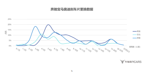 在三个品牌中,奥迪的到店维修频率明显高于奔驰和宝马,是宝马的1.6倍,奔驰的2.4倍。首先,奥迪比奔驰和宝马的保养周期短决定了它的到店频次相对要多,奥迪是7500km,而宝马和奔驰是10000km;其次,频繁到店也反映了奥迪故障率确实较之宝马和奔驰偏高。 今年的数据,主要针对易损件和部分故障进行了分析,看看还有什么发现吧! 1、奔驰、宝马、奥迪三个品牌中,奔驰的刹车片最不耐用,奥迪刹车片更耐用。