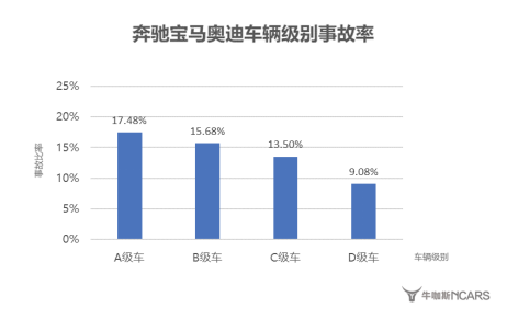 根据车型在汽车等级划分都有分布的奔驰、宝马、奥迪的车型事故率做了对比,从数据上看A级(奥迪A3、宝马1系、奔驰A)、B级(奥迪A4、宝马3系、奔驰C)、C级(奥迪A6、宝马5系、奔驰E)和D级(奥迪A8、宝马7系、奔驰S)四个等级车型平均事故率在14.10%, A级车和B级车均高出平均事故率,分别为17.48%和15.68%,C级车和D级车均低于平均事故率,分别为13.50%和9.08%。其中,A级车事故率最高,D级车事故率最低。 从数据不难看出,车辆等级越高事故率相对越低。首先,这个数据与车辆的安全性能有关,级别越高的车主动安全性能设施更完善,比如自动刹车、车道偏离警示、侧面车辆距离警示等;其次,受驾驶员的技能高低影响,相较A级车,D级车驾驶员的平均驾龄相对更长,技能更娴熟,甚至一些高级别的车都是专业司机在驾驶,一定程度降低了事故发生率;最后,在路上行驶公里数越多发生事故的概率越高,对于车辆来讲,D级车的平均里程比A级车一般会少很多,大多D级车主一般都不止一台车辆,行驶里程决定了出现在路面上机会,出现事故的概率也随之降低。